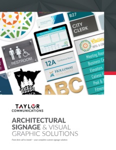 INFORMATION Helpful information about Taylor Communications, the ADA and ADA-compliant signage Cornerstones of a successful partnership are information and transparency. Let us introduce ourselves so you have a better understanding of who we are as a company and what we do for our customers. We believe in sharing what we know to help you become a more informed consumer, whether you choose to work with us or not. We hope you find the information in this section helpful and invite you to contact us with your questions. 04 LET'S INNOVATE Information Delivering for the customer is our number one priority. We are at the forefront of developing custom digital print and signage products and will continue to be a pioneer of innovation. Built with customer-centered practices, our project teams work closely with you to deliver quality products and exceptional service. We have the experience and the technology to respond to your unique requests, and we are developing new products every day to help you respond to evolving markets. WHO WE ARE We are redefining what’s possible with visual graphics. Our products are used to transform spaces in retail, healthcare, hospitality, financial and educational markets, to name just a few. Our best-in-class print technology and ever-expanding portfolio of specialty products are the benchmark for innovation, service and quality. OUR CUSTOMERS You will find our customers in the healthcare, manufacturing, professional, financial, hospitality, and retail industries. They are Fortune 100 enterprises, Main Street businesses, and individual customers. We have the technology and product offering to provide unique solutions designed to drive sales for our customers. WHATWE DO We leverage our experience across a wide variety of industry segments to provide unique solutions designed to meet the demands of a changing marketplace. From concept to completion, we partner with you to turn your ideas into products that transform, communicate, brand and beautify. CONTACT US We invite you to reach out to us for more information or if you have a project you’d like us to review. taylorcommunications.com 800.442.5254 1725 Roe Crest Drive, North Mankato, MN 56003 52 Information Architectural Signage 53 Information Architectural Signage